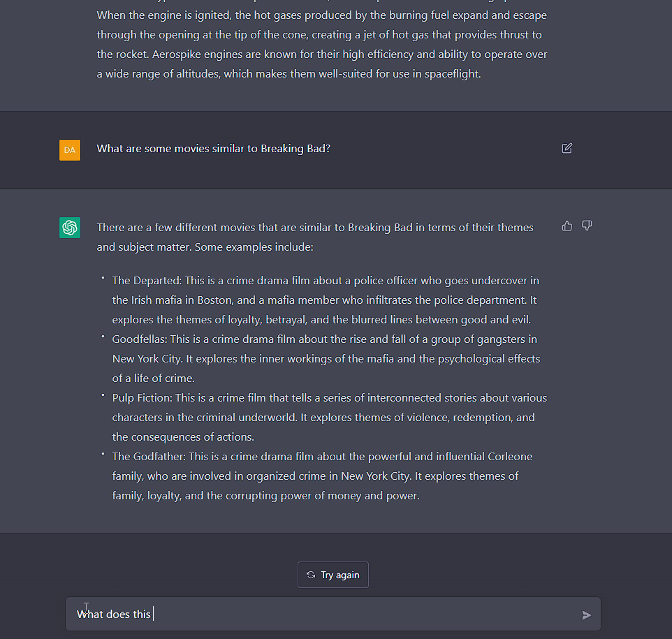 This means the model can be asked questions and answers them, given a piece of wrong code and find the potential problems in it and it also remembers the past actions. It feels almost like we are talking to a human.