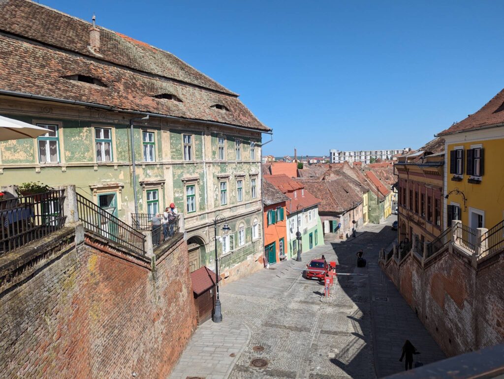Not long after we arrived in Sibiu – a medieval town with a rich history and many buildings from medieval times. There are remains medieval walls and towers built mainly in the Germanic architecture. This architecture is a legacy of 12th-century Saxon settlers. The town has a nickname: The Town with Eyes because historically, a lot of buildings had open rooftops. The place is also known for its gastronomy and its Christmas market. Additionally, I read that it was a hometown of two renowned scientists – Conrad Haas and Hermann Oberth – 16th and 19th century rocket scientists. With these facts in mind, we started our morning routine with a stop at the coffee shop. The staff there were really nice – we ordered a coffee and I ordered a cup of hot chocolate. We had a little chat about the coffee and where we come from. They were amused by the fact that we come from Slovenia stating, that Slovenia was really nice and green. One of the customers also said that they used to work in Slovenia at Krka (a pharmaceutical company). We shared their amusement and told them that we were enjoying Romania as well. The weather was nice and the interaction made us excited about things to come.