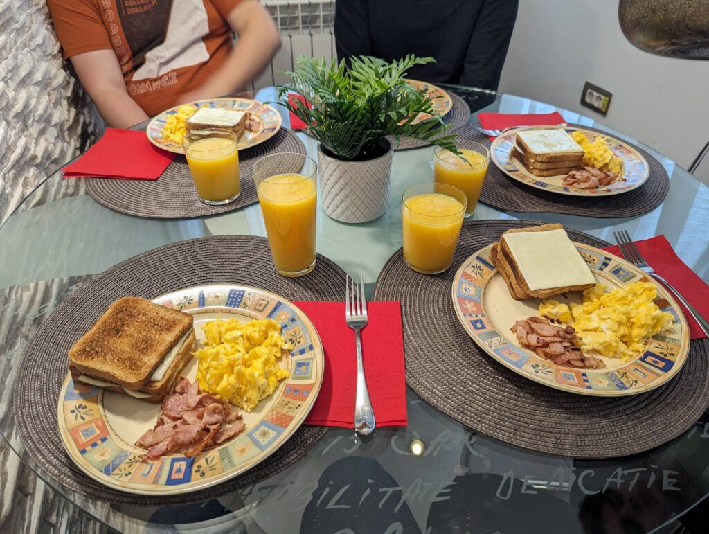 We woke up late, the night was long and eventful, but I won’t go into details. It was a calm rainy day, perfect for sightseeing and making ourselves a breakfast. We decided not to eat out for once, so we headed to the nearby Mega Image. Mega Image you say? Well, no, it is not a camera equipment shop, it is a grocery store. I woke up earlier than some of my friends and so the three of us who were awake, decided to do the shopping for today. We bought some bread, eggs, bacon and a bottle of orange juice – a filling, tasty breakfast.