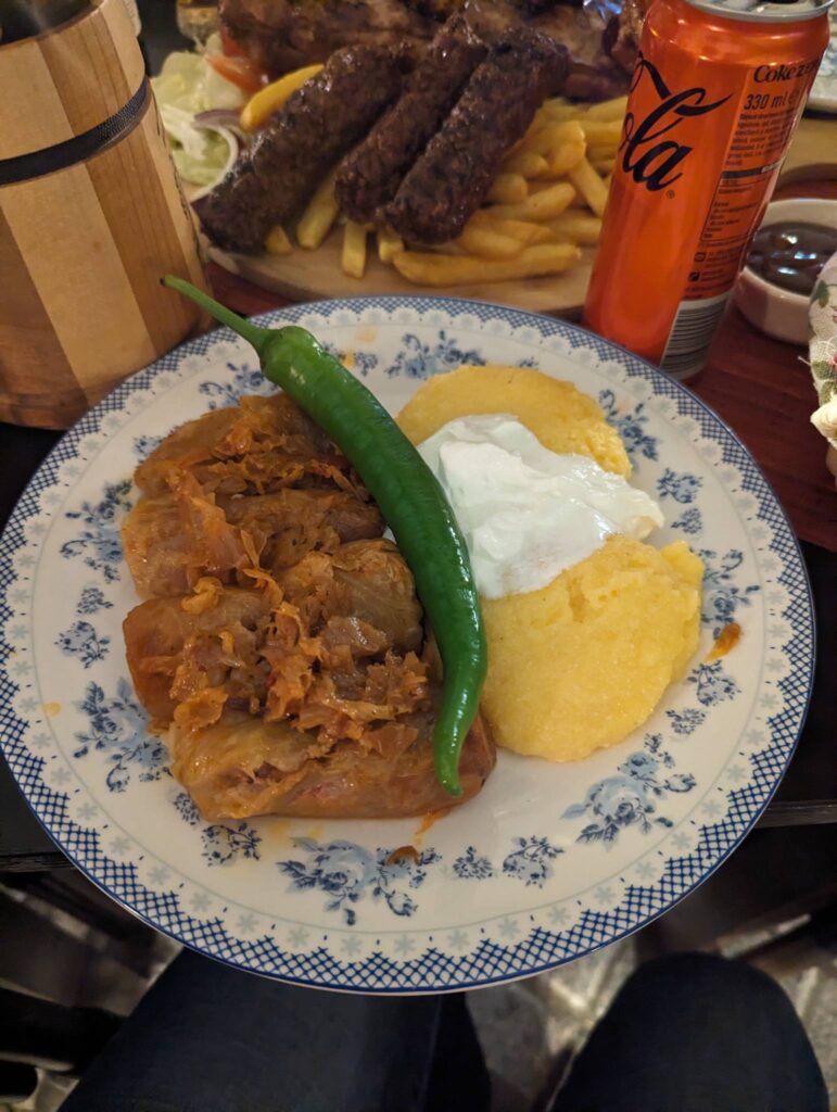 The rest of our time in this small city was spent visiting the various stalls with baklava, alcoholic drinks, diary products, handicraft and much more. We each bought something to bring home. I bought a marmalade, my friends bought some baklava. Soon after we left for Brasov. We spent the evening in Brasov. We ate some food at a diner named Dracula. We didn’t have high expectations given the previous experiences. But disappointed we were not. I ordered sarma, a traditional Romanian dish that is also often eaten on the Balkans. It is quite a simple dish – just minced meat (with rice) wrapped in cabbage leaves and cooked in a tomato based sauce. It was one of my favourite dishes that I haven’t tasted in a while. The food was served fast and it was delicious, the prices were good, and we weren’t scammed. I was pleasantly surprised and my evening was made better! This was the conclusion of the two days.
