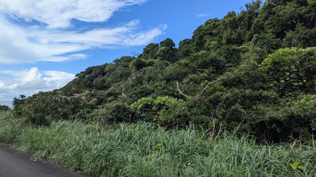 Our chatter made the time pass really quickly and we were soon in Motomachi. We thanked him for the ride and we parted ways. But a while later when we were waiting for the bus, he approached us and explained that unfortunately, there was no bus. Thus we were presented with another option: taxi or renting a bike. I had already planned renting a bike the following day, so this decision was easy. We rented an e-bike (denki jitensha 電気自転車) and headed towards the south of the island via the west coast. The e-bike was realitevly cheap, costing us 3000 JPY (roughly 18,5€) for the entire day. The west coast is where most of the attractions are and there is a nice trail most of the way to the destination. We had to do a bit of cycling on the road but it was not a big deal since the road wasn’t that busy. Cycling was an excellent way of letting our legs rest a little bit, enjoy the nature and observe the many animals that we found on our way. One prominent creature that inhabits every inch of this island is a black and yellow coloured spider that looks like the most poisonous thing ever. I read that luckily they are only venomous (not deadly) and that they are unlikely to bite even when in contact with human skin. However, this did not change the fact that I had cobweb everywhere on my bike. Spiders weren’t the only living thing roaming this land though. We also came across a couple of monkeys that were crossing the road via an electric pole. We stopped and observed their every move and they stared back at us. They didn’t seem to be too interested in having any interaction and neither did we. The Japanese macaque are not known to attack people, but provoking a monkey has never lead to a good result either so we moved on.