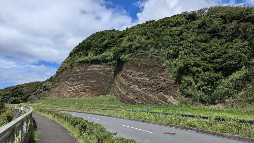 Our first destination was a really cool stone wall that had a wavy pattern. This walled was created during the excavation of a ledge for the road built on it. The wavy pattern reminded me of the sediments that usually form such patterns. But this wasn’t the same thing. This wall was created over hundreds if not millions of years though erruptions of Mt. Mihara. Each new erruption formed a new layer as the lava cooled down. The last erruption of Mt. Mihara occured around 40 years ago but it wasn’t nearly strong enough to be the cause of this geological feature.