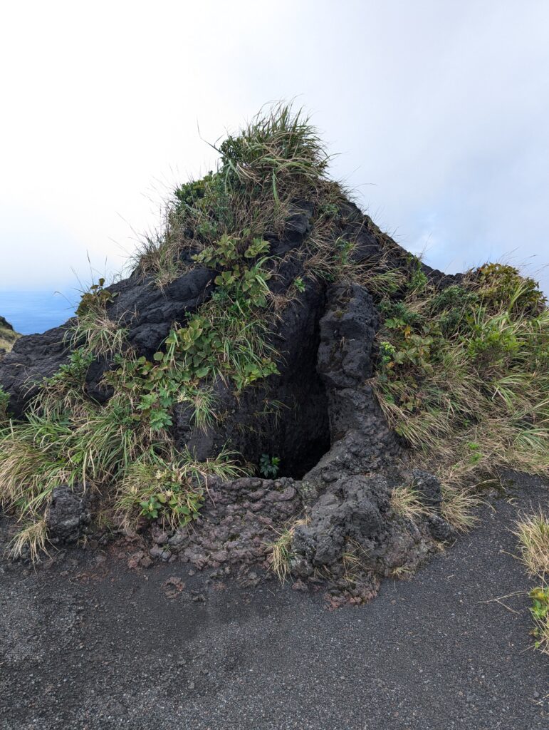 After about 40 min I reached the peak of the volcano. The circular trail around the rim of the volcano allowed me to see all of the volcanic geological features that I came here to see – the black desert, the volcanic crater and the many fissures that were created over the years. There was also an entrance to a cave – completely unprotected – that was created during one of the erruptions by the lava flows. The caves are appearently home to many ceiling plants that started growing there after the lava flows stopped. Another really interesting thing that I saw atop of the mountain was the GPS system used for determining potential future erruptions. The way it works is that there are multiple GPS stations. Each of the stations periodically broadcasts its location to the central station. The central station then compares the locations and looks for any changes. Using this information it can determine potential future erruption, fissure openings etc. It has also been shown that Mt. Mihara – and by extension the whole island of Izu Oshima – is currently expanding. This most likely implies the build-up of lava below the mountain, which will likely lead to an erruption some time in the future.