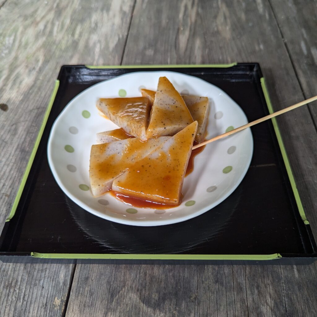 Halfway through the valley I also came across a small building that looked like a shop. From the outside I couldn’t really see anyone in it. But after approaching the small tea shop an older man emerged outside. He greeted me with a smile on his face and asked me if I wished to buy anything. I was a little bit hungry so I asked if food was being sold here. He pointed at a blackboard with three different dishes (or rather snacks). There was a bunch of kanji, some of which I did not understand, and among the items something called “konyaku”. I frankly wasn’t sure what this was, but I trusted my senses and ordered the mysterious dish. And I received a bunch of jelly triangles covered with sweet miso sauce. After looking up this dish, it turns out it is made of a root of the plant konjac, a plant that is pretty popular in this region. The triangles themselves did not have a strong taste, but coupled with the warm miso sauce the dish tasted quite well. Turns out this dish is pretty popular among hikers, since it is full of fibres and gives you a quick energy boost.