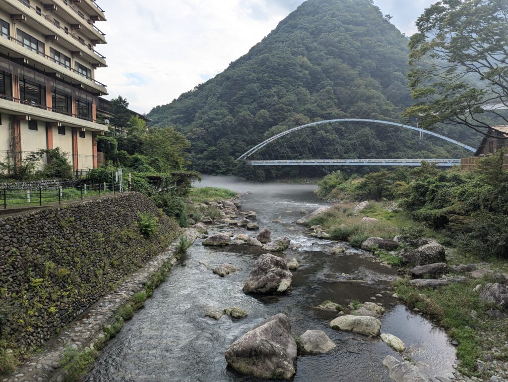 The town of Kawaji was pretty similar to Kinugawa. There were also some abandoned hotels and there were a lot of onsens. However, most of them seemed to be part of a hotel and I was seeking something that I could use quickly. Especially given my bloody socks, I did not want to walk around the hotel and cause any trouble. Luckily for me, I found an onsen that fit my requirements. There was just one catch – it was an open-air onsen. Something even I haven’t tried before. And while walking on the other side of the river I could see the (mostly elderly) men bathing in the onsen. No fence or anything, just a clear view of the pool and the people in it. I guess I had no choice – I really wanted to get rid of the blood. And on a side note, the view of the river from here was astonishing – the fog above the river made it look really mystic and mysterious!