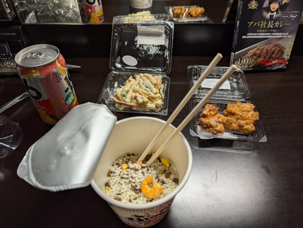 Now back to Fukushima, where we arrived later in the afternoon. Given the fact we had spent half the day in Nikko we didn’t have much time left in Fukushima. Only an evening and that was about it. We decided we would go for an evening stroll. No destination in mind, just walking around a little bit until we found something interesting – such as a shopping centre, a shrine or anything similar. After walking for a bit I opened Google maps to check our location. And I saw a spot on the map that seemed to be crowded (for those unaware, Google maps has a feature that shows you spots where large groups of people are located). And I thought it might be interesting to go there. The crowded spot proved to be a big shopping centre. With nothing better to do, we walked into one of the shops – a potentially costly decision. The shop had so many items we just could’t resist buying some snacks, a sudoku and a couple other things. Everything was super cheap, 100 JPY for almost every item we bought. The next destination was a supermarket. Yet again, decisions were hard to make. Wa wanted to buy something for dinner, but there was simply too much to choose from! Tenpura, ramen, onigiri, karage… Anything and everything. But after some careful consideration I decided to buy a salad, some karage, a cup of ramen and an orange flavoured fuzzy drink. It wasn’t a Michelin starred dish, but I was pretty happy with it.